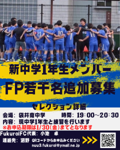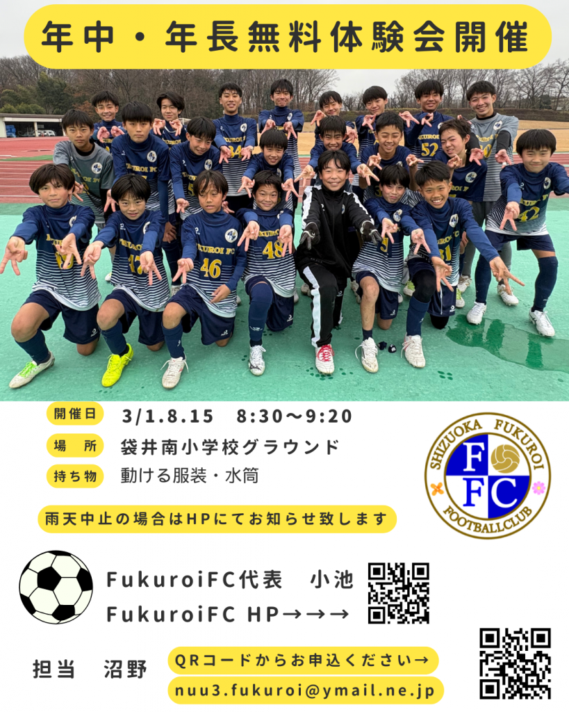 2026年1月27日 / 最終更新日時 : 2026年1月27日 袋井FC投稿者 クラブニュース キッズ 無料体験会 Fukuroi FCではキッズの無料体験会を開催いたします。 【日程】 3/1.8.15(日) 8:30〜9:20 *雨天延期時はHP・Instagramにて連絡いたします。 【会場】 袋井南小学校G 【対象】 年中・年長 【申し込み方法】 QRコードを読み取る→メール作成から必要事項を記入。 皆さんのご応募お待ちしております!